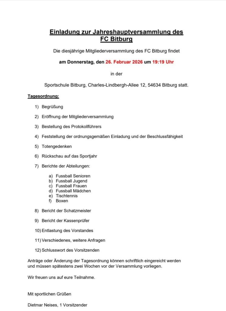 am 26. Februar findet die jährliche Jahreshauptversammlung des FC Bitburg statt. Im Anhang die offizielle und auch fristgerechte Einladung.